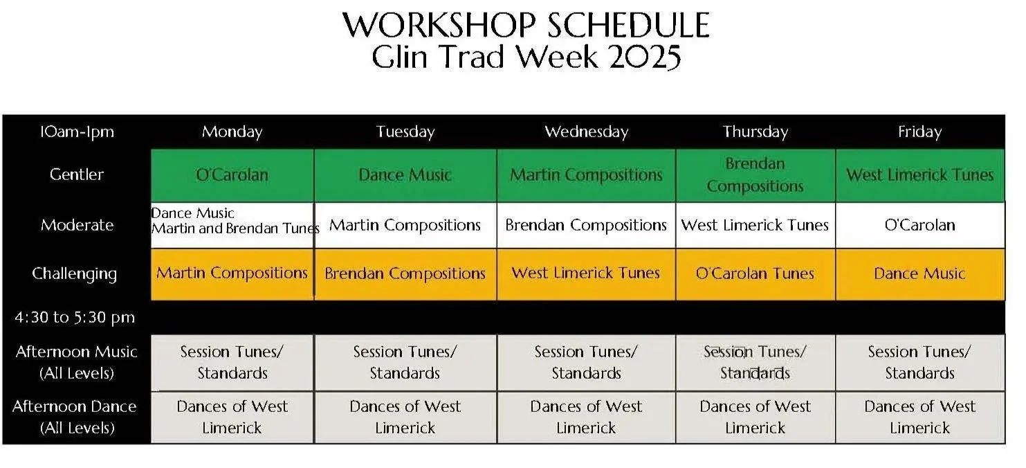 For the musician, the all access pass is the best deal. Includes morning and afternoon workshops, concerts, ceili, and walks. Does not include Special afternoon workshops. There are separate tickets for those.